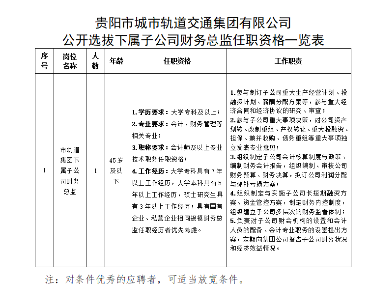 贵阳市城市轨道交通集团有限公司 公开选拔下属子公司财务总监的公告