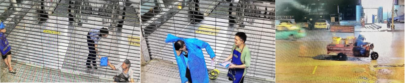 车站行车值班员通过监控摄像头进行雨天巡查时,发现了这两位正低头看手机的宵夜摊主。值班站长第一时间送上了两件厚实的雨衣,二人充满惊喜与好奇,环顾四周,发现了摄像头,用笑容表达感谢后,穿上雨衣离开。