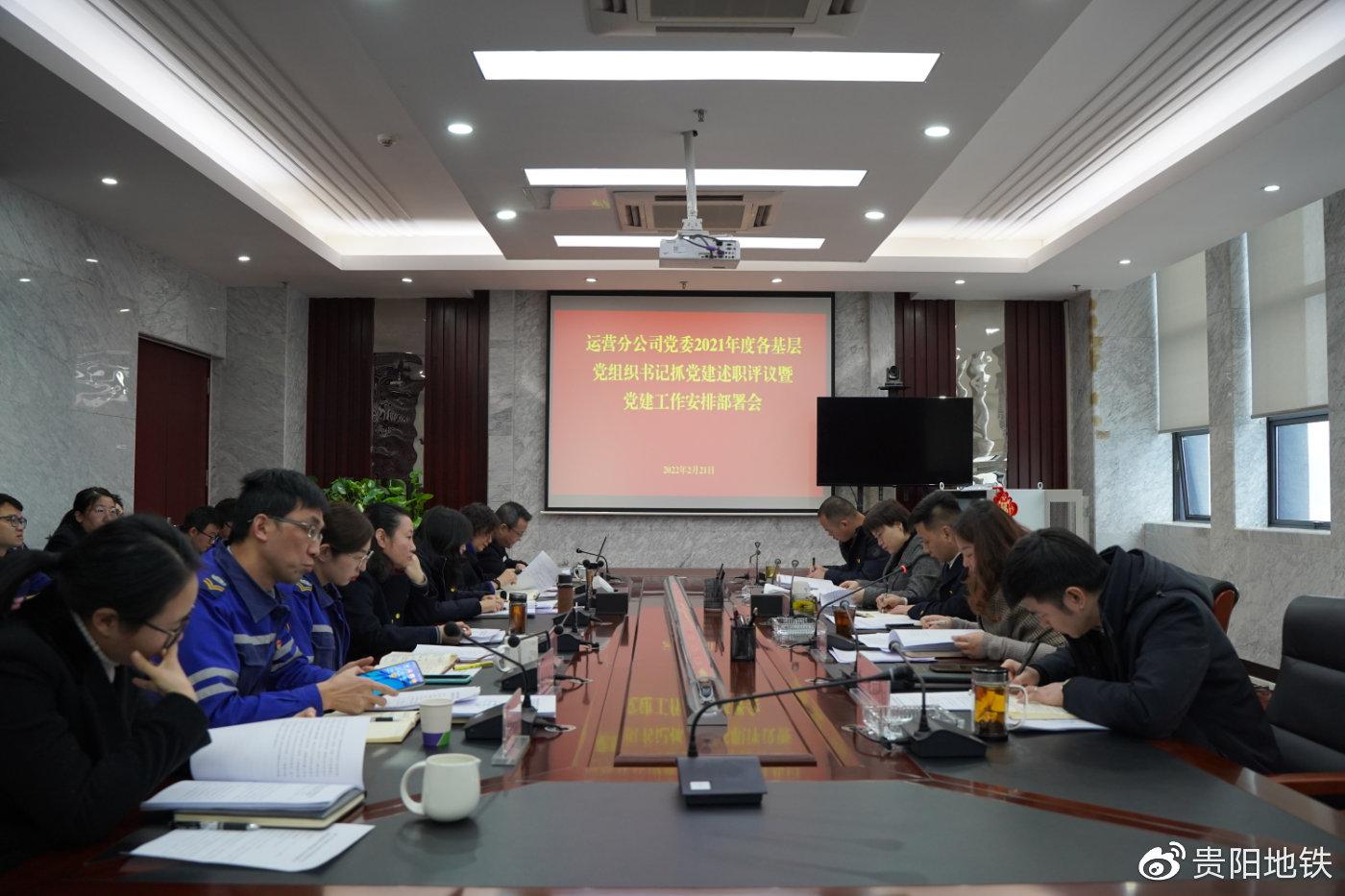 ??2月21日,贵阳轨道集团运营分公司党委召开2021年度基层党组织书记抓党建述职评议暨党建工作安排部署会。贵阳轨道集团总经理助理、运营分公司党委书记、总经理杨波对分公司党建工作进行安排部署,运营分公司党委班子成员、各基层党组织书记和党员代表参加会议。