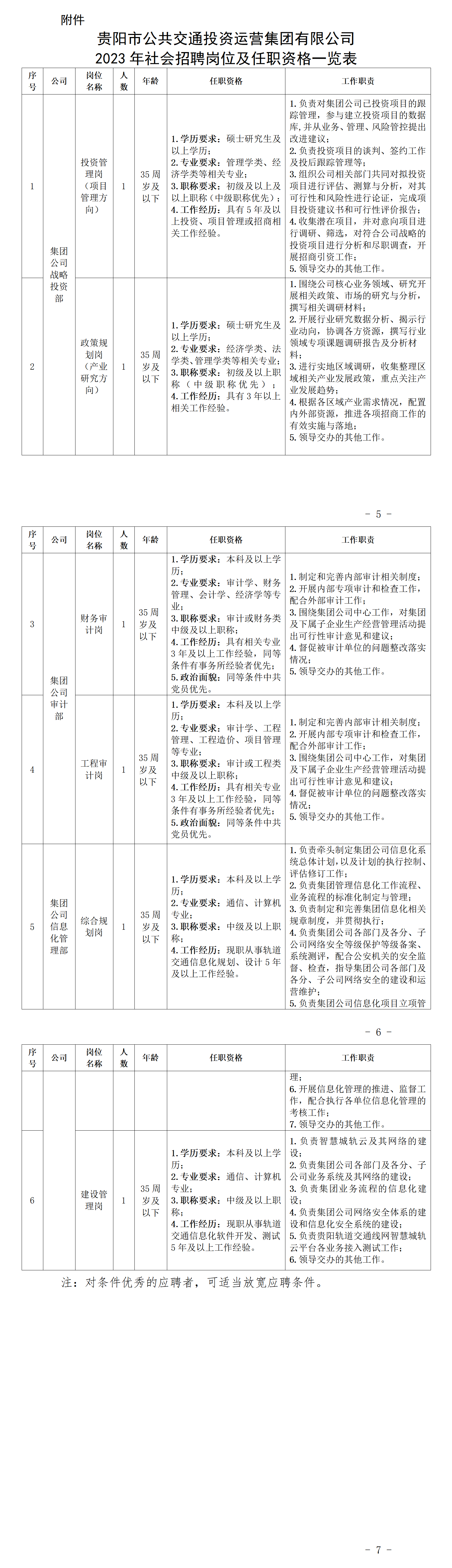 招聘岗位及任职资格详见附件1《贵阳市公共交通投资运营集团有限公司2023年社会招聘岗位及任职资格一览表》。