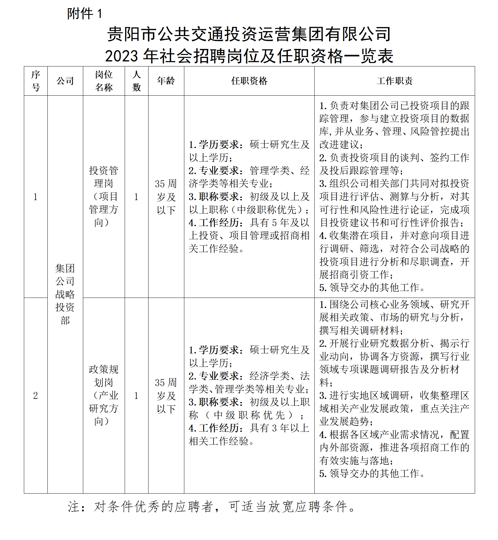招聘岗位及任职资格详见附件1《贵阳市公共交通投资运营集团有限公司2023年社会招聘岗位及任职资格一览表》。