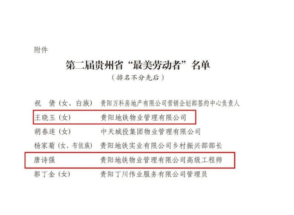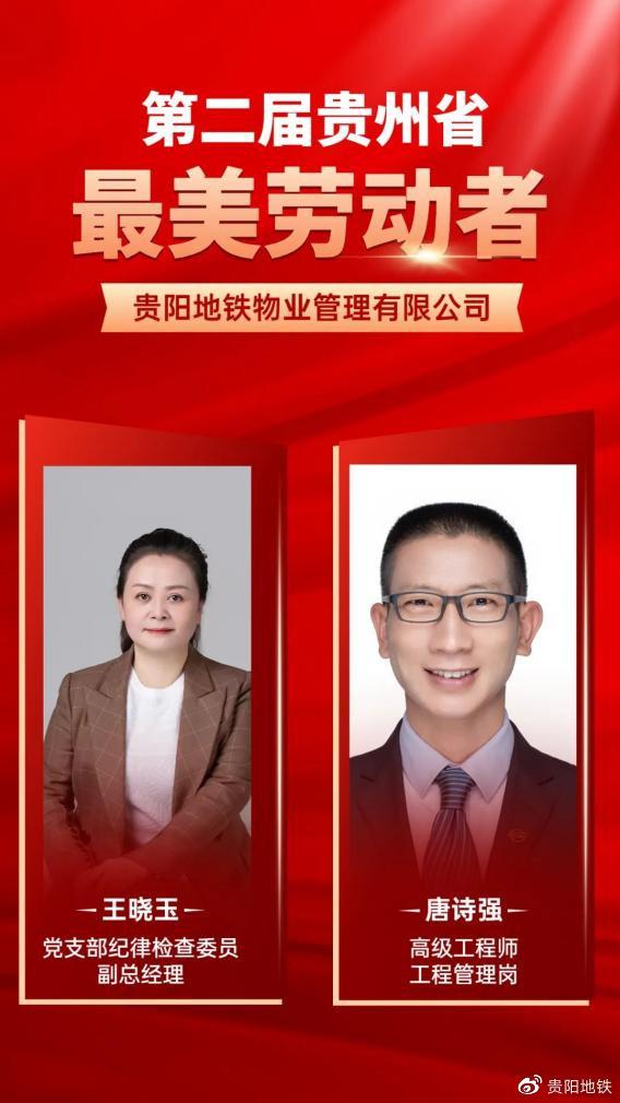 ??近日,在由省总工会、省委宣传部、省人力资源和社会保障厅、共青团省委、省妇联联合开展的第二届贵州省“最美劳动者”选树活动中,贵阳地铁物业管理有限公司职工王晓玉、唐诗强光荣当选。